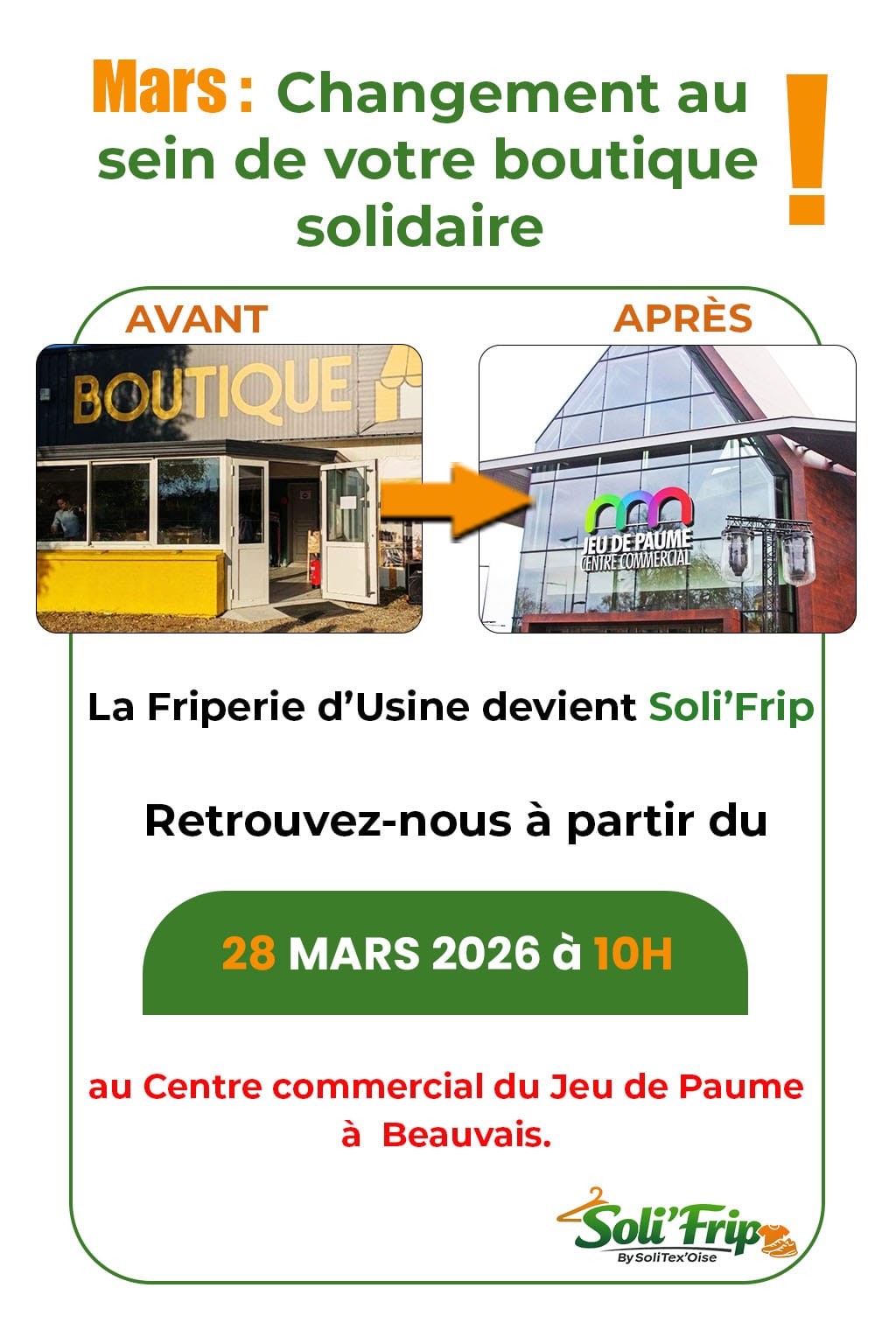 LA FRIPERIE D’USINE DEVIENT SOLI’FRIP avril 17, 2026 Nos derniers articles LA FRIPERIE D’USINE DEVIENT SOLI’FRIP SOLITEX’OISE DEBARQUE SUR TIKTOK GRANDE BRADERIE SAMEDI 7 JUIN 2025 10H-18H Ouverture de votre Friperie d’Usine Où nous trouver ? votre FRIPERIE D’USINE !!!